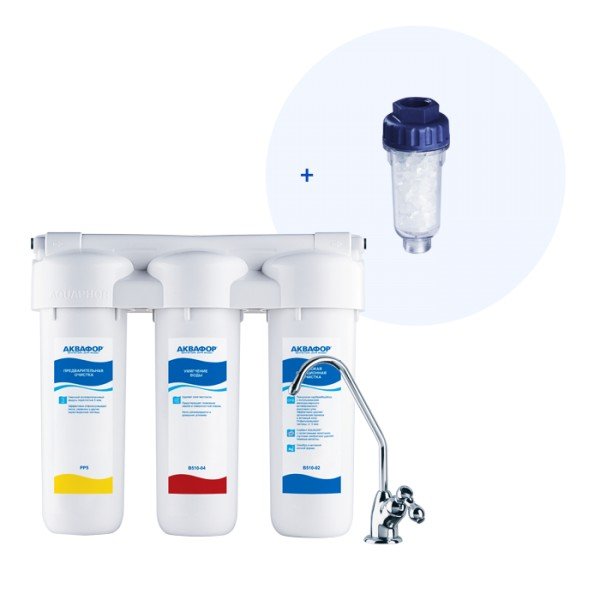 Обратноосмотические фильтры используются для абсолютной защиты от накипи, т.к. полностью устраняют соли жесткости из воды.нетЧисло ступеней очисткиКартриджи последовательно очищают воду и от видимых примесей, и от растворенных. Первый картридж задерживает более крупные частицы, а каждый последующий - более мелкие. Чем больше ступеней - тем лучше фильтр очистит воду: поймает более мелкие видимые частицы ржавчины, песка и ила, успеет захватить из воды максимум растворенных примесей - хлора, нитратов, тяжелых металлов и других.3Механическая фильтрацияЗадерживает ржавчину, ил, песок, как “сито”. Если в фильтре несколько картриджей - первый отсекает самые крупные частицы, а каждый последующий - более мелкие. Существуют картриджи, в которых есть только механическая очистка (полипропиленовые, не “впитывают” растворенные примеси). Они обычно стоят первыми по ходу воды, чтобы продлить жизнь угольным (сорбционным) картриджам, которые ещё и впитывают вредные примеси, как губка.даИонный обменНужен, чтобы умягчать воду, а также задерживать тяжелые металлы. За это отвечают ионно-обменная смола и Аквален (волокна, которые есть во всех фильтрах Аквафор, чтобы устранять тяжелые металлы даже из жесткой воды). Чем больше ионно-обменной смолы - тем лучше фильтр справится с жесткостью. В небольшом количестве она есть во всех фильтрах под мойку. Если же в фильтре есть отдельный картридж, заполненный такой смолой (например, KH), - фильтр помогает умягчать воду. Для слишком жесткой воды (более 5 мкв) лучше выбрать фильтр обратного осмоса.даСорбцияСпособность “впитывать” из воды растворенные, “невидимые” вредные примеси, по принципу губки. Активированный уголь - основной сорбционный материал, который используется в картриджах фильтров для питьевой воды. Например, именно так из воды удаляется хлор.даУмягчениеУдаление из воды солей жесткости (солей кальция и магния, из-за которых образуется накипь в чайнике, белые пятна на посуде, известковый налет). Фильтры обратного осмоса абсолютно умягчают воду с любой концентрацией солей (то есть удаляют соли жесткости полностью). Проточные фильтры со специальными картриджами рекомендуются только для умягчения воды средней жесткости (той, в которой средняя концентрация солей кальция и магния - до 5 млэкв/литр).стандартноеМинерализацияПроисходит после финишной очистки воды. Необходима прежде всего в фильтре обратного осмоса, поскольку такой фильтр полностью устраняет из воды все примеси, в том числе минералы. Минералы добавляются в оптимальной концентрации - для пользы и привычного вкуса воды.нетПостфильтрацияФинальный этап очистки воды: картриджи постфильтрации удаляют самые мелкие механические частицы и кондиционируют воду, придавая ей более приятный вкус.нетПрименениедля холодной водыНакопительная емкостьОбычно нужна в фильтрах обратного осмоса. Глубокая фильтрация требует времени. Чтобы Вам не приходилось ждать, пока вода наберется в чайник или кастрюлю, почти во всех моделях используется накопительный бак для чистой воды или другая емкость. В стандартном фильтре обратного осмоса под мойку воды в баке достаточно для семьи из 5-6 человек.нетФильтрует частицы крупнее, мкмЧем меньше цифра, тем более мелкие частицы способен задержать фильтр. Например, любой фильтр под мойку справится с ржавчино