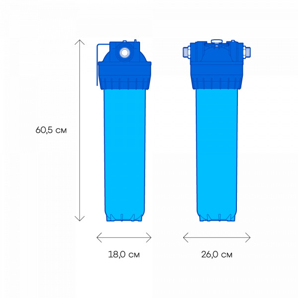 Габариты26,0 x 18,0 x 60,6 смМеханическая фильтрацияЗадерживает ржавчину, ил, песок, как “сито”. Если в фильтре несколько картриджей - первый отсекает самые крупные частицы, а каждый последующий - более мелкие. Существуют картриджи, в которых есть только механическая очистка (полипропиленовые, не “впитывают” растворенные примеси). Они обычно стоят первыми по ходу воды, чтобы продлить жизнь угольным (сорбционным) картриджам, которые ещё и впитывают вредные примеси, как губка.даКомплектацияГотовый фильтр состоит из корпуса и картриджа для очистки воды. Если вы приобретаете только корпус, необходимо отдельно купить подходящий к нему картридж: это может быть картридж для механической очистки воды от ржавчины, картридж для глубокой очистки воды от хлора.готовый фильтрВодаКартриджи и корпуса фильтров рассчитаны на определенную температуру воды. Данные технические характеристики важно учитывать, поскольку от этого зависит качество очистки и срок службы фильтра.холоднаяМатериал корпусаПищевой пластик: Допущен к контакту с пищевыми продуктами. Нержавеющая сталь: Долговечный и безопасный корпус из нержавеющей пищевой стали.пищевой пластикОчисткаМеханическая очистка: Задерживает ржавчину, ил, песок, как “сито”. В корпусе предфильтра с механической очисткой установлен полипропиленовый модуль. Глубокая очистка: Подходит, чтобы купать детей в чистой воде. Делает прием душа и умывание более приятным. Фильтр глубокой очистки воды во всей квартире не только останавливает ржавчину, ил, песок, но и впитывает растворенные опасные примеси, как губка. Удаляет из воды хлор, хлорорганические вещества, пестициды и другие загрязнители.механическаяДля холодной водыда